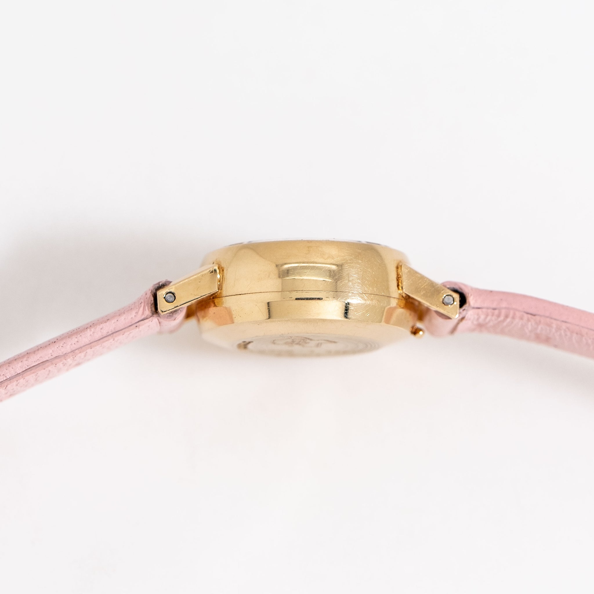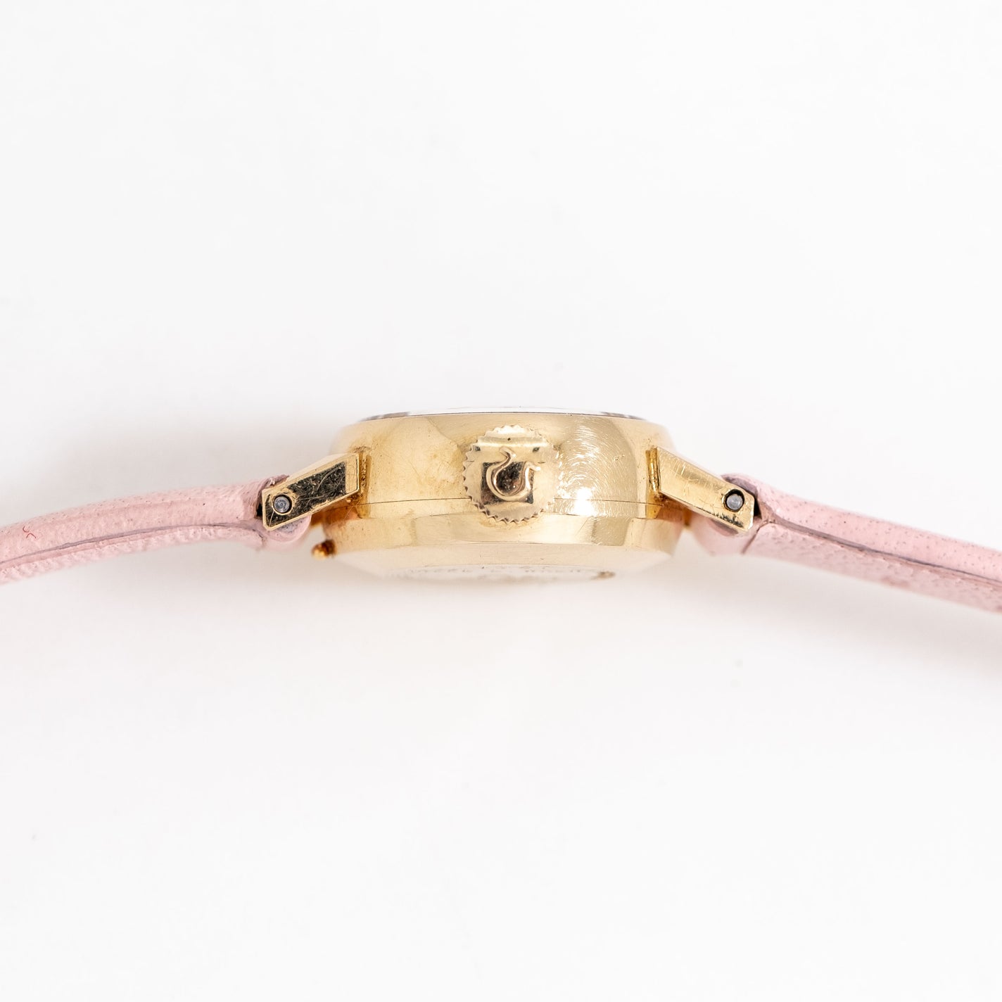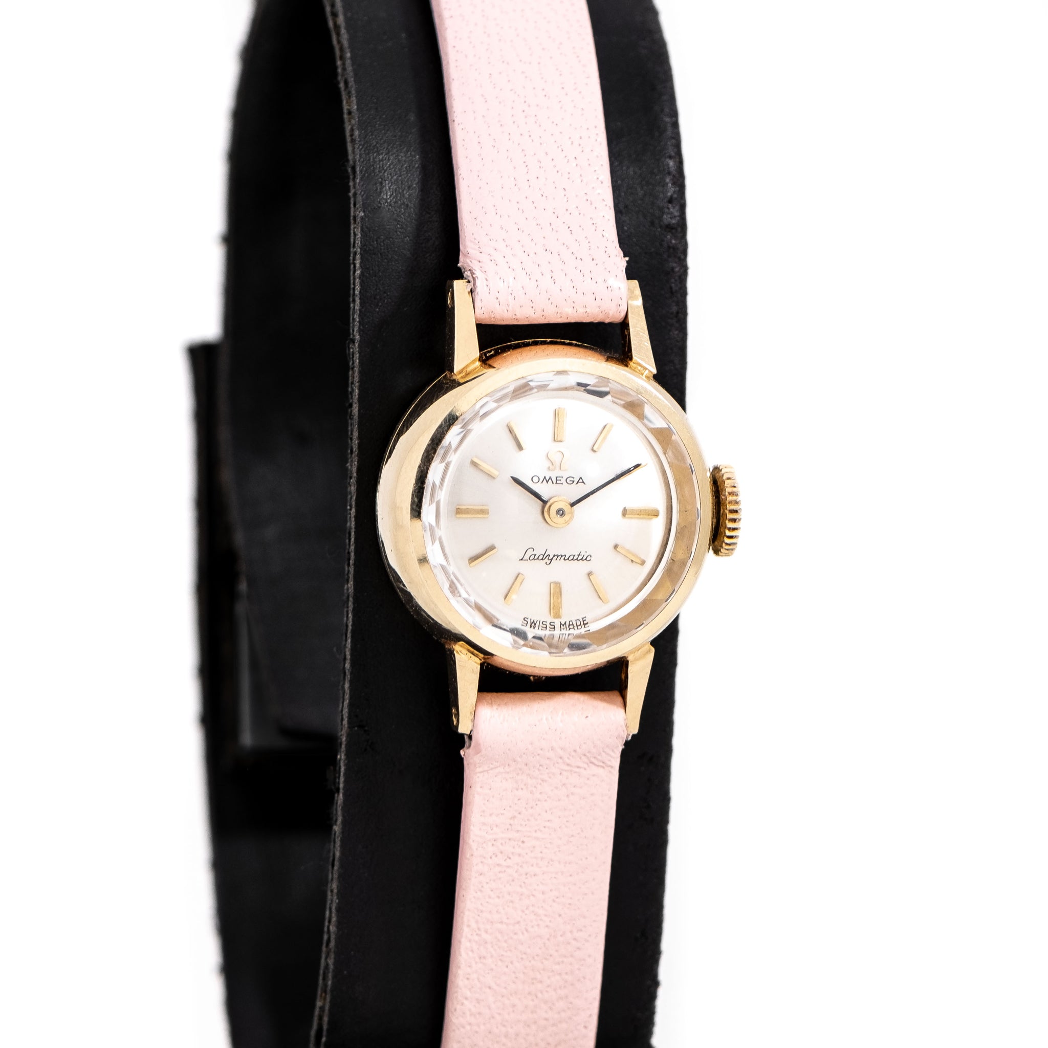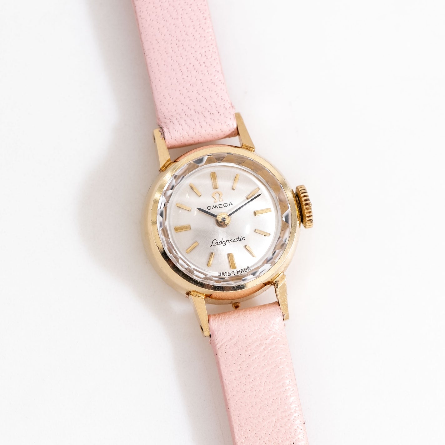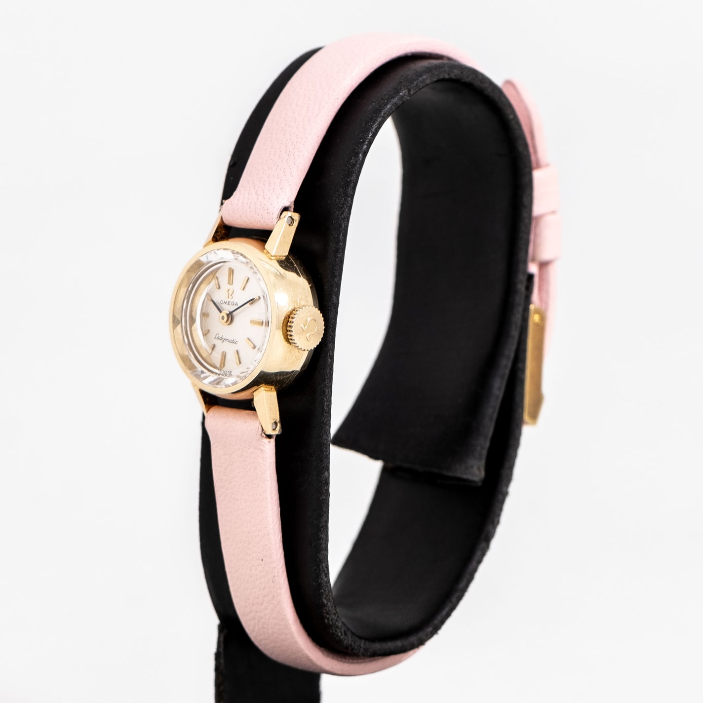1966 Vintage Ladies Omega Ladymatic Ref. SS5740 Solid 14k Yellow Gold Watch. Features an all Original Silver Dial in Very Good Condition with Applied Yellow Gold Colored Stick Hour Markers, an Applied Yellow Gold Colored Omega Emblem, and Black Colored Stick Hands. Comes on an 8mm Genuine Leather Pink Colored Strap with an Original Omega Gold Plated Buckle. Powered by a 17 Jewel Caliber 660 Automatic Winding Movement. Triple Signed. Swiss Made.