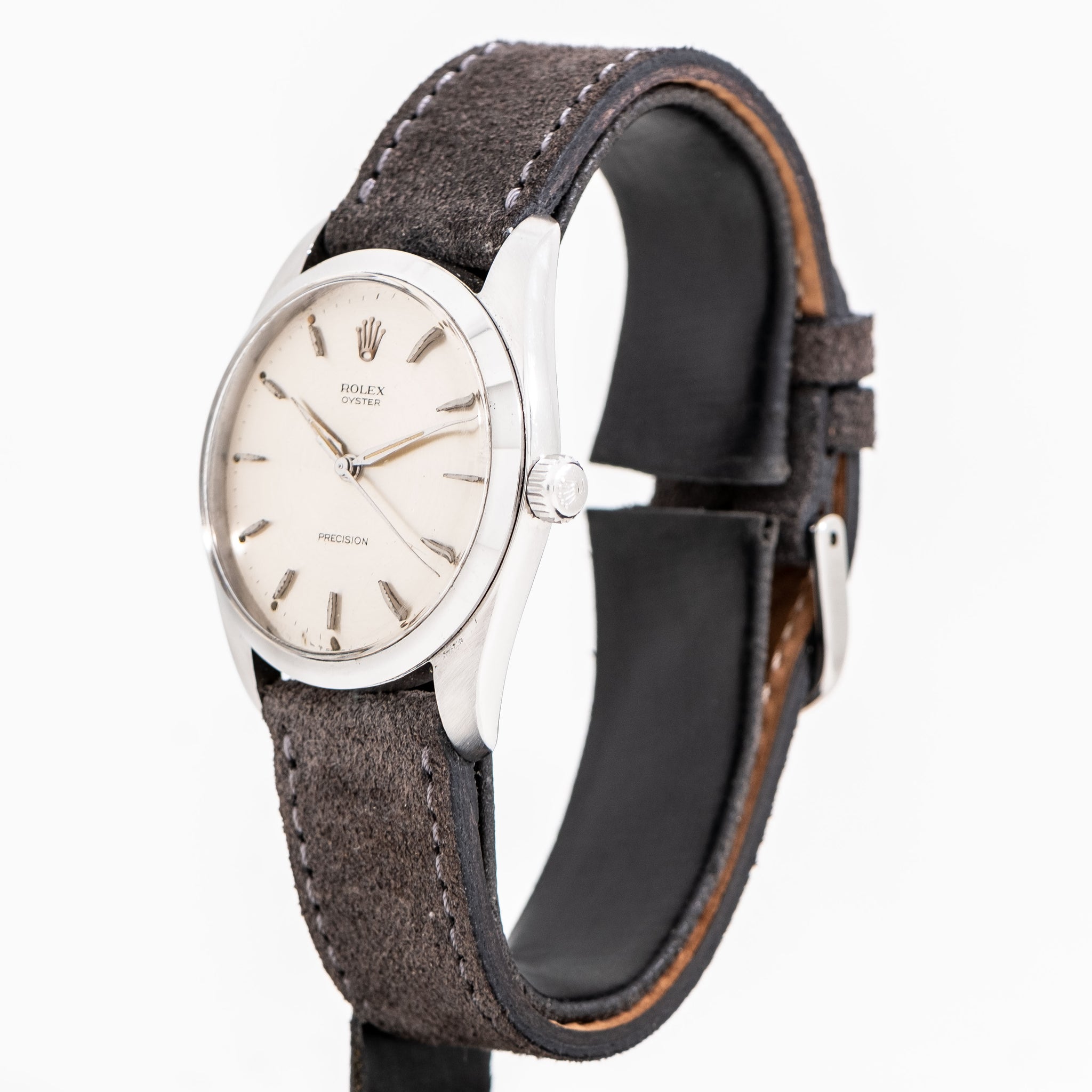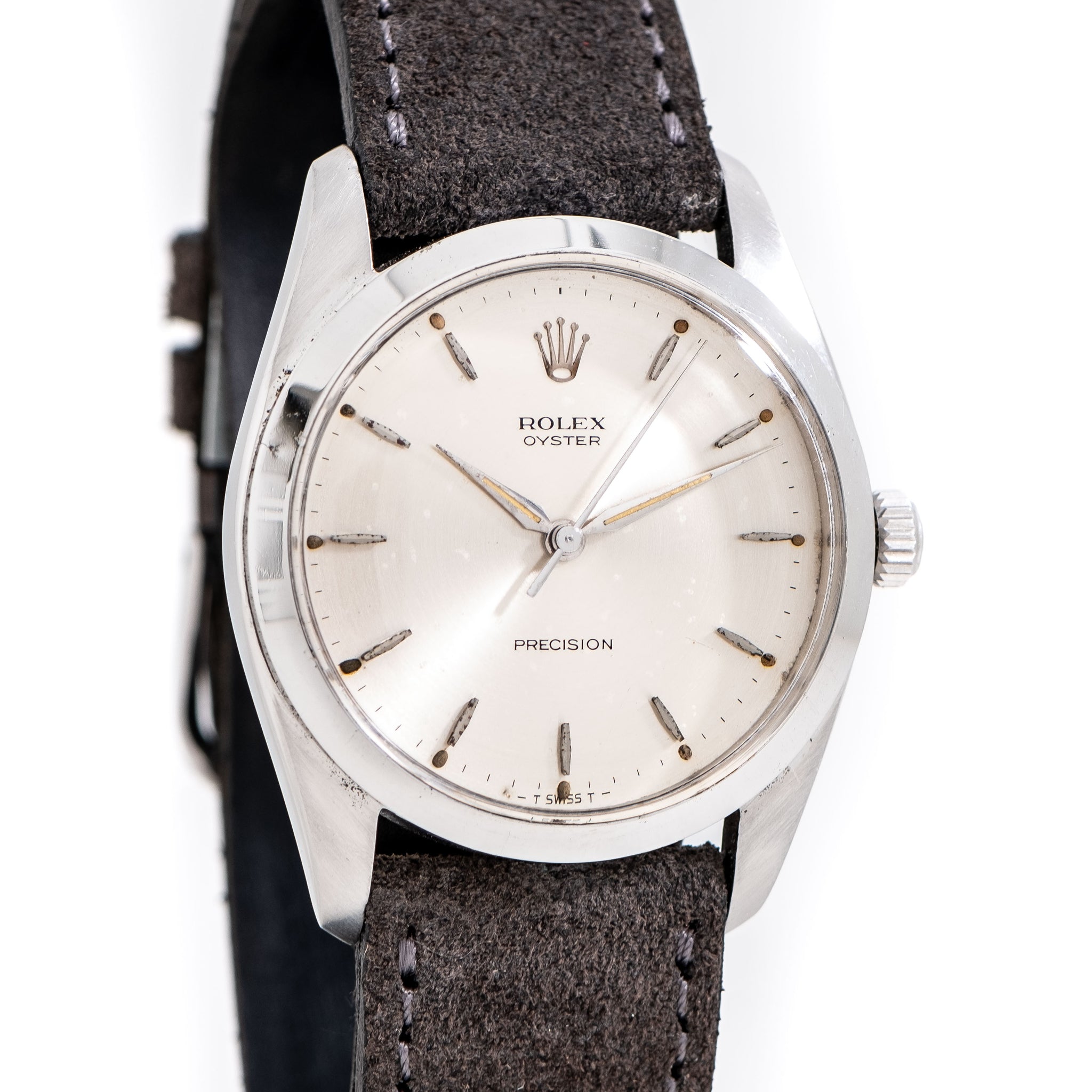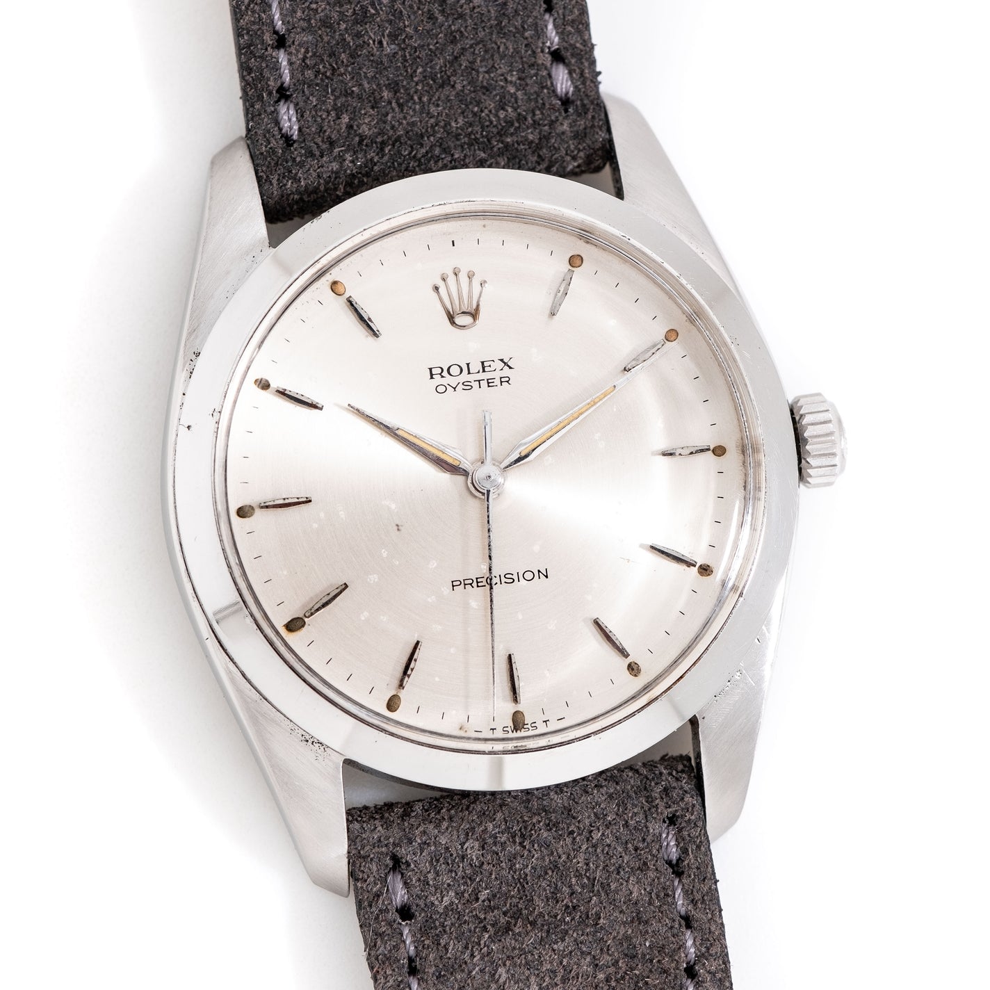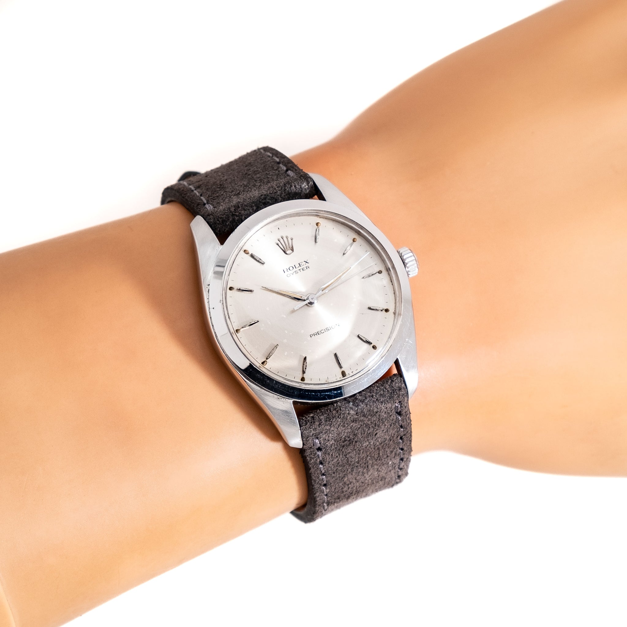 1966 Vintage Rolex Oyster 36mm Ref. 6424 Stainless Steel Watch. Features an all Original Silver Dial with Beautifully Aged Speckled Patina, Applied Steel Colored Hour Markers with Warm Aged Luminous Plots, and Steel Colored Alpha Hands with Warm Aged Luminous. The Case Measures in at 36mm not Typically seen for Manual Oyster Models. Comes on a 19mm Genuine Suede Leather Grey Colored Strap. Powered by a 17 Jewel Caliber 1215 Manual Winding Movement. Triple Signed. Swiss Made.