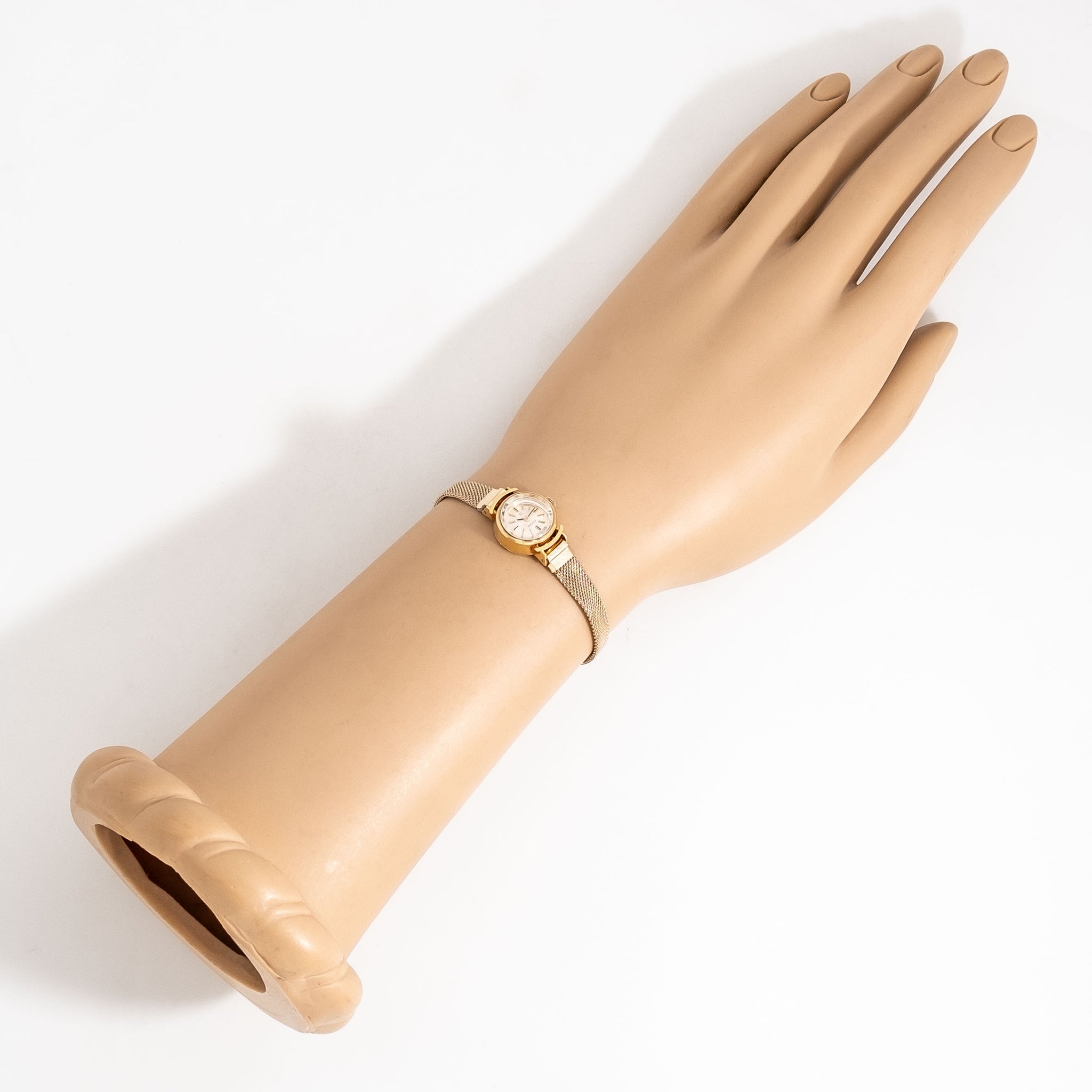 1967 Vintage Ladies Omega Solid 18k Yellow Gold Watch. Features an all Original Silver Dial in Very Good Condition with Applied Yellow Gold Colored Stick Hour Markers with Black Colored Accents, a Fancy Lug Design, and Yellow Gold Colored Black Colored Stick Hands. Comes on a 6mm Generic USA Made Gold Filled Mesh Bracelet that will Fit up to a 6 1/2 Inch Wrist Size. Powered by a 17 Jewel Caliber 650 Manual Winding Movement. Triple Signed. Swiss Made.
