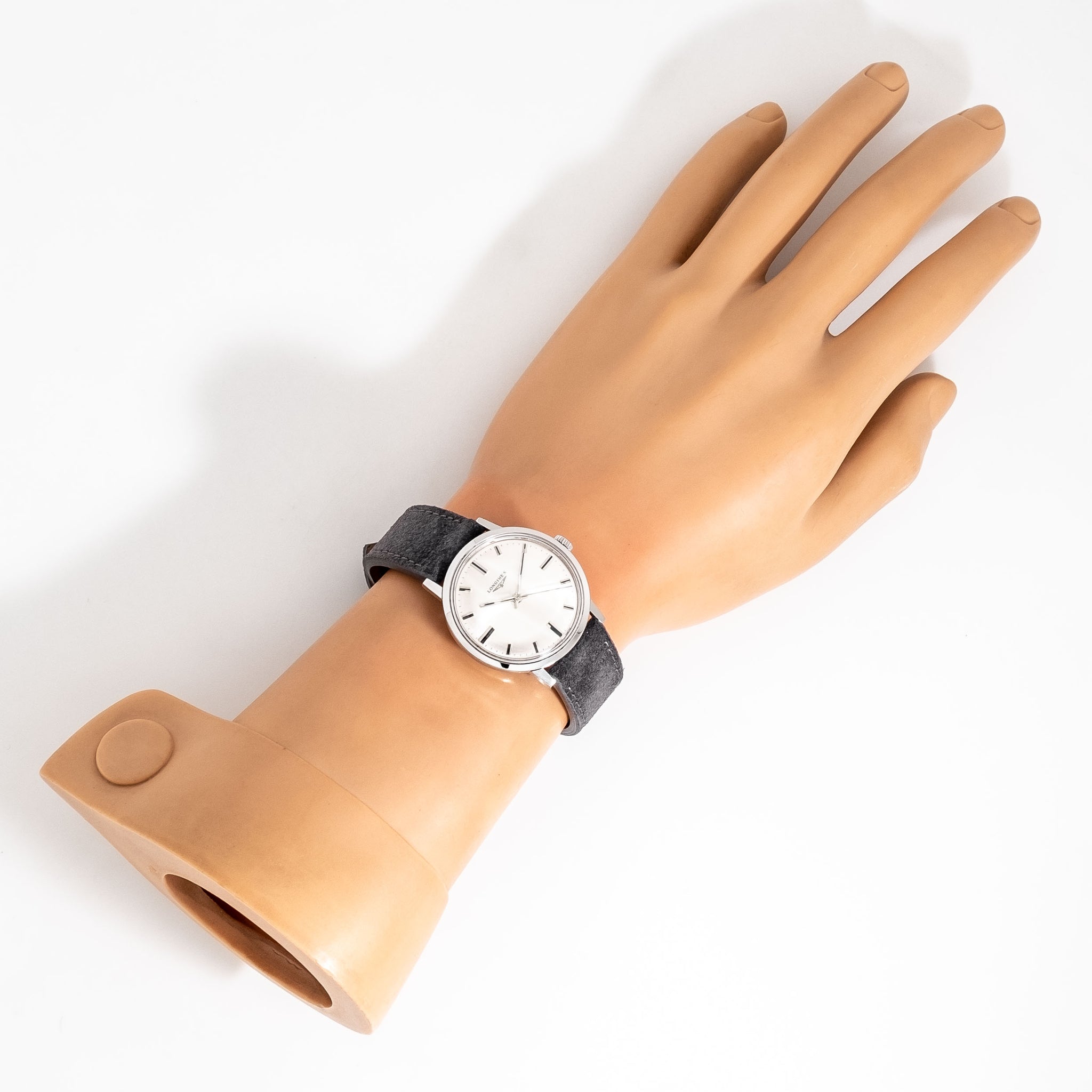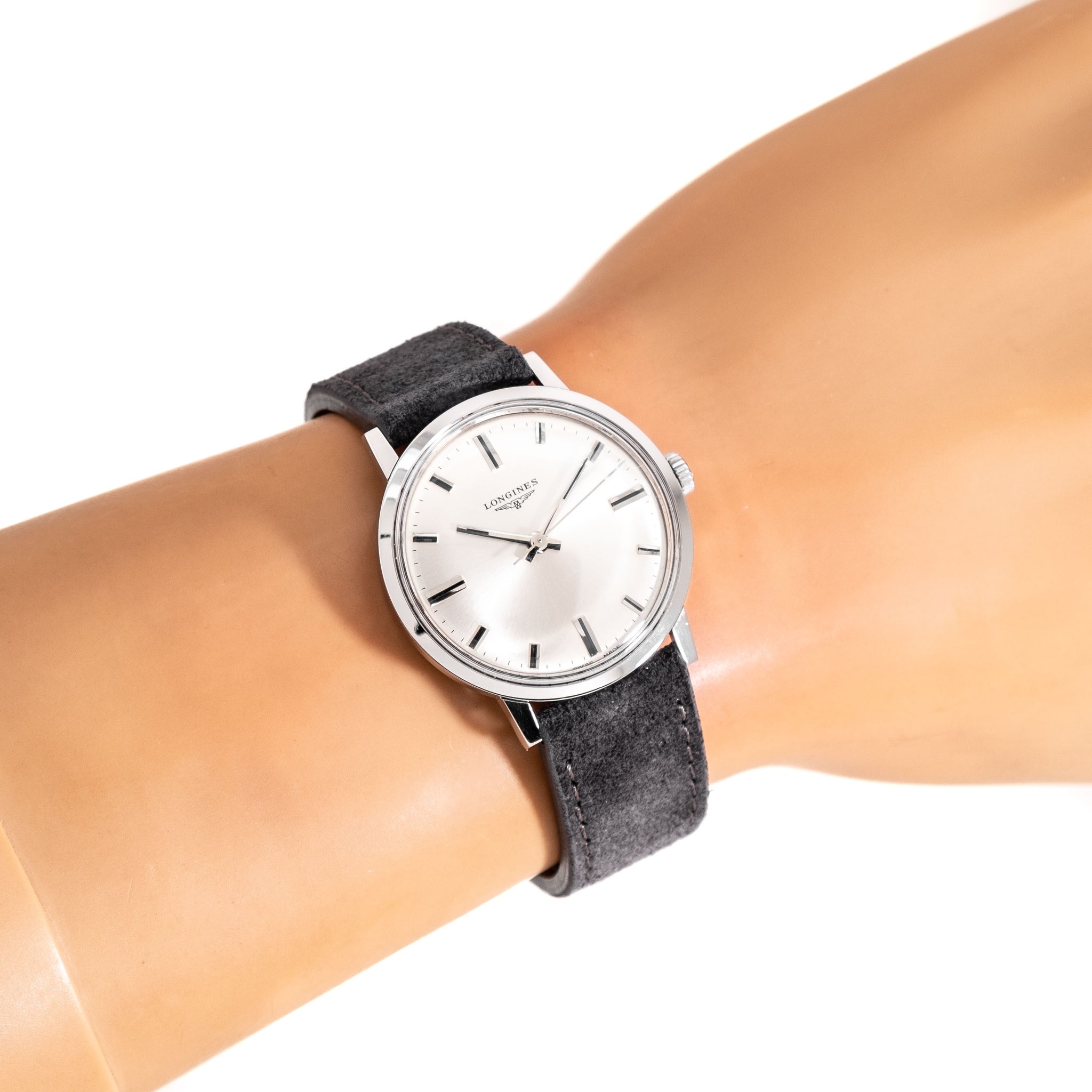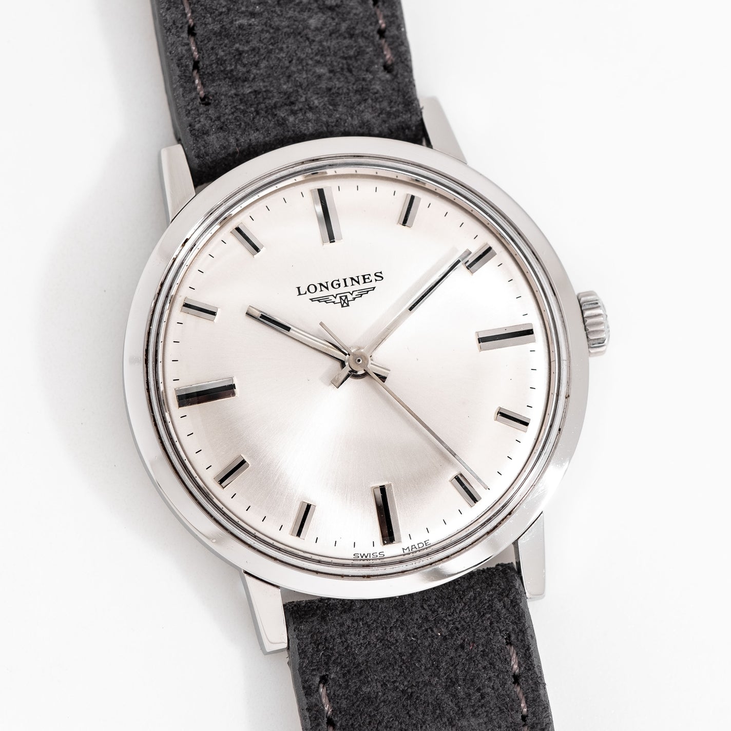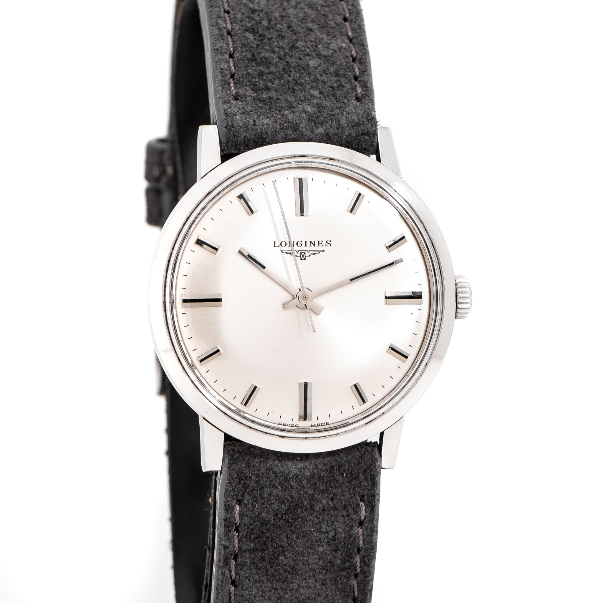 1967 Vintage Longines Ref. 7841 1 Stainless Steel Watch. Features an all Original Warm Aged Silver Dial in Very Good Condition with Applied Steel Block Hour Markers with Black Colored Accents, Printed Black Colored Minute Track, and Steel Baton Hands with Black Colored Inlays. Comes on an 18mm Genuine Suede Leather Grey Colored Strap. Powered by a 17 Jewel Caliber 284 Manual Winding Movement. Triple Signed. Swiss Made.