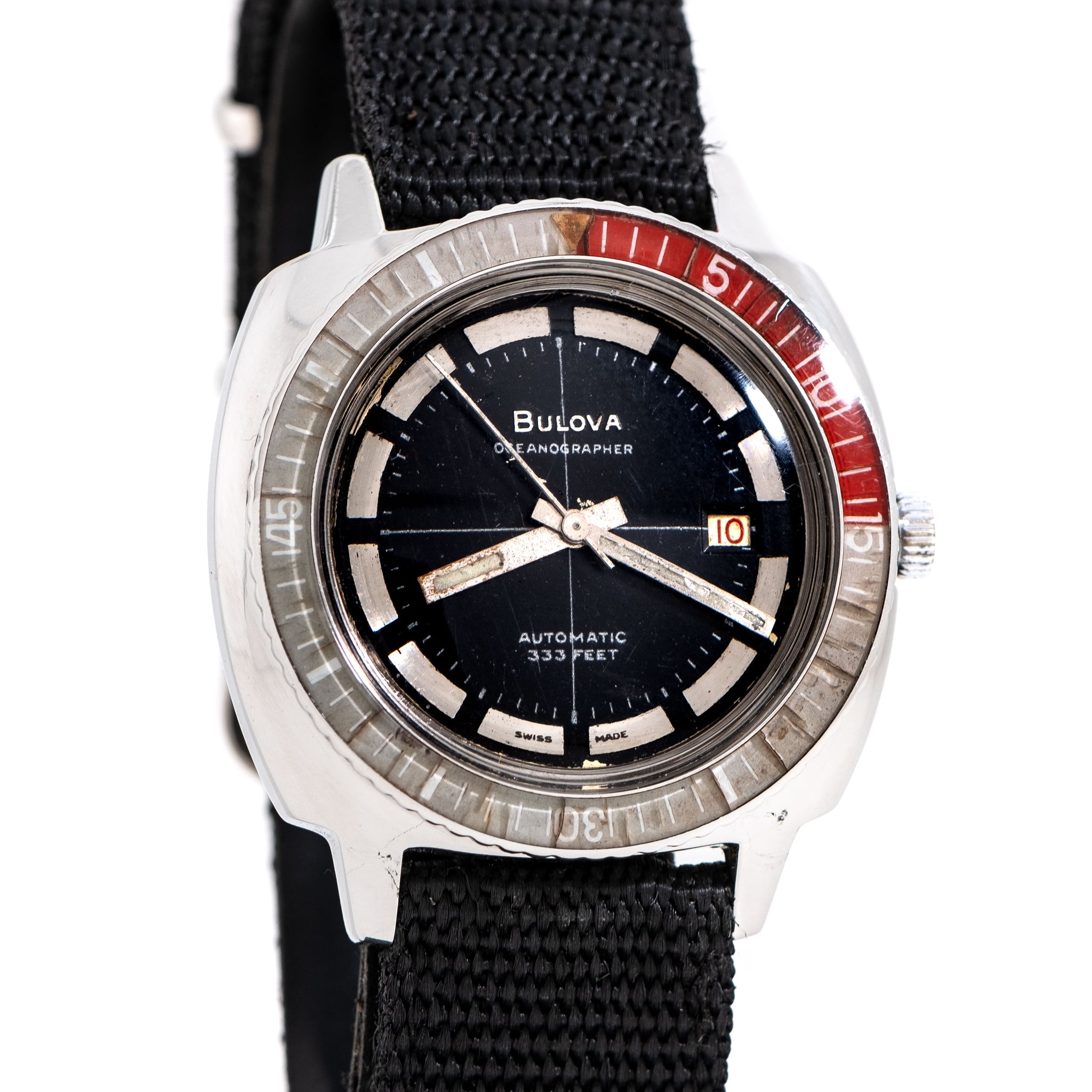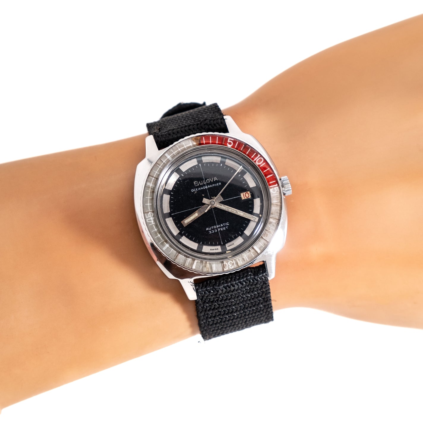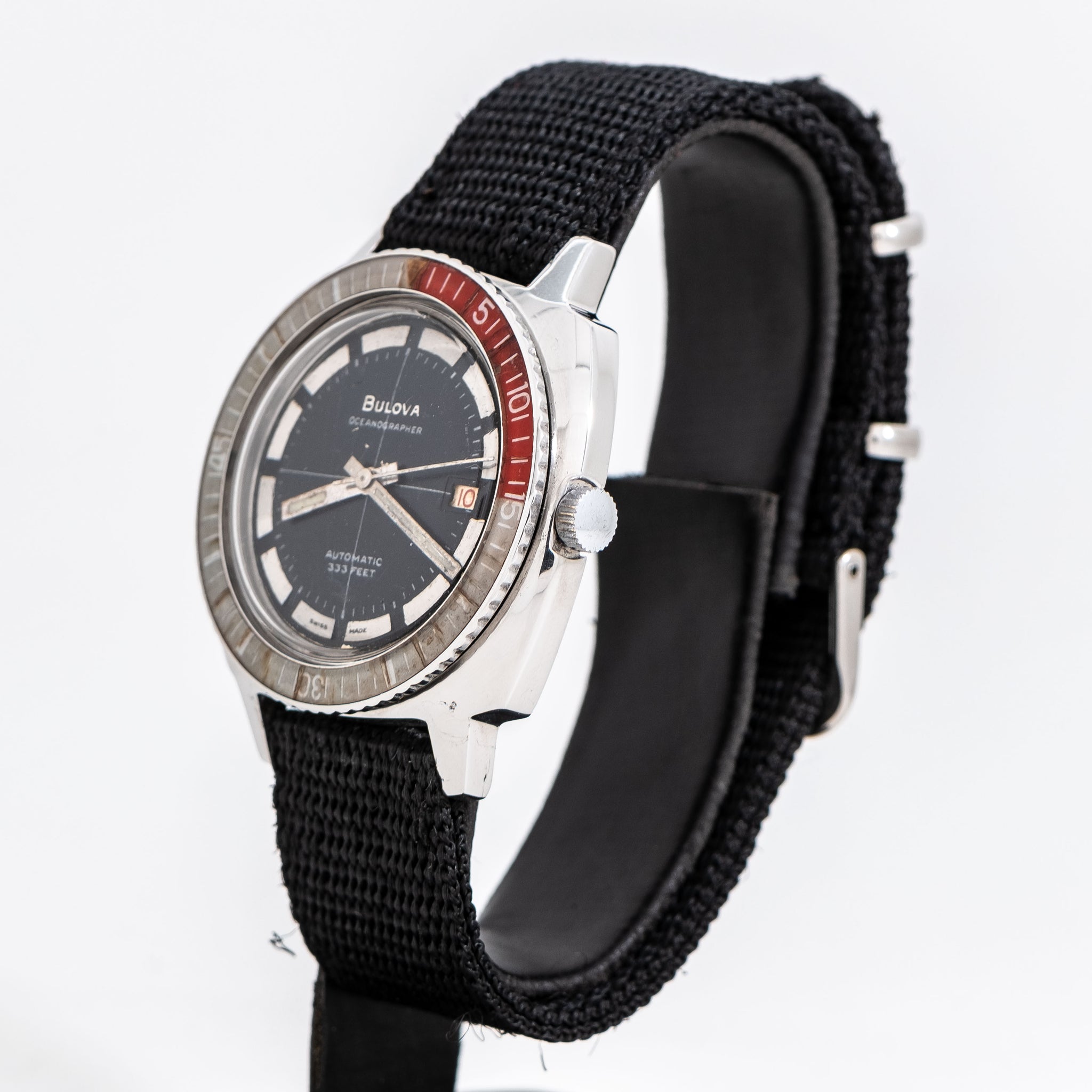 1969 Vintage Bulova Oceanographer Stainless Steel Watch. Features a Professionally Restored Black Colored Dial with Aged Patina, Date Window at the 3 o Clock Position, Block Steel Oversized Hour Markers, a Bi-Directional Numerated Bezel, and Steel Baton Hands with Aged Luminous. Comes on a 20mm Black Colored Nylon Strap. Powered by a 17 Jewel Caliber 11BLACD Automatic Winding Movement. Swiss Made.