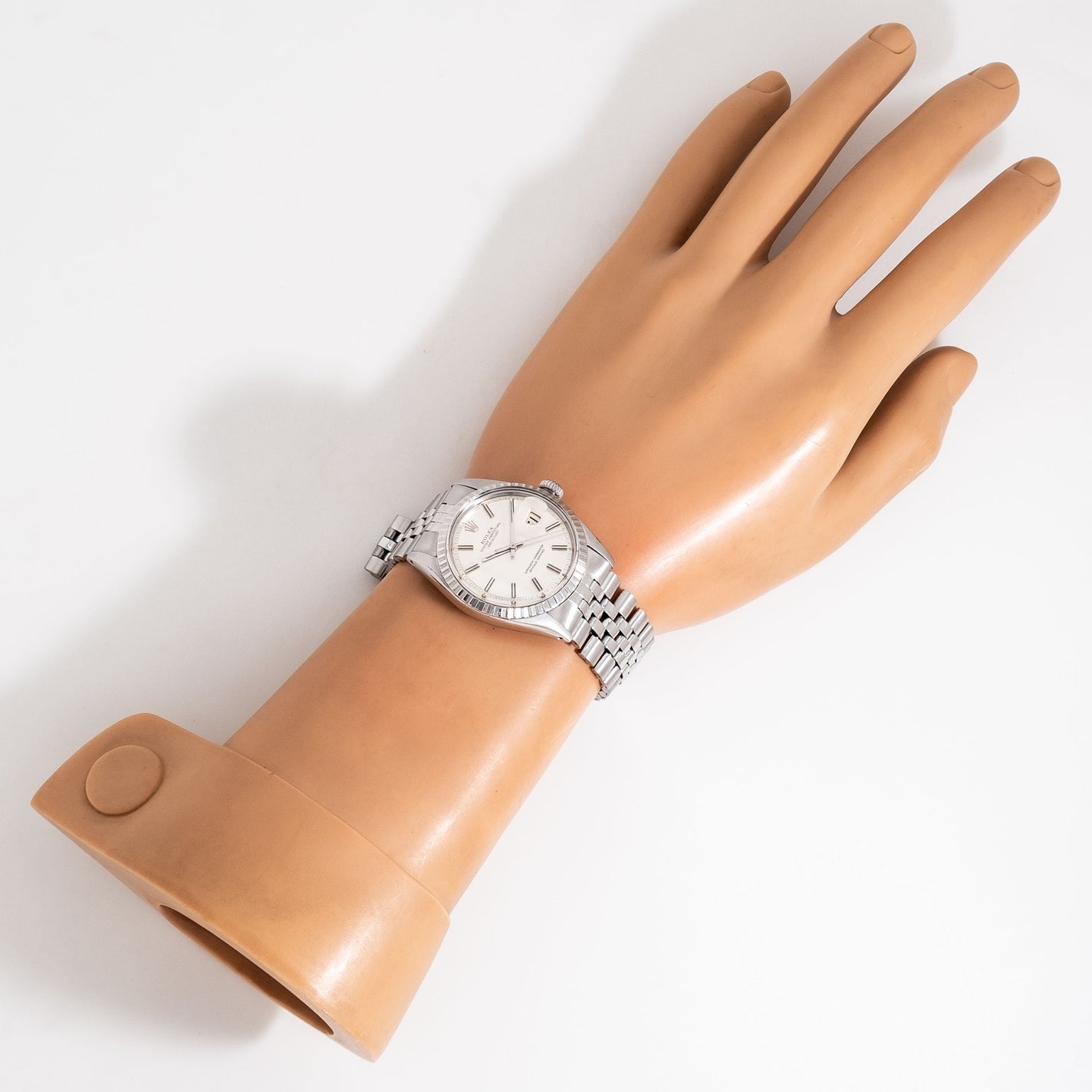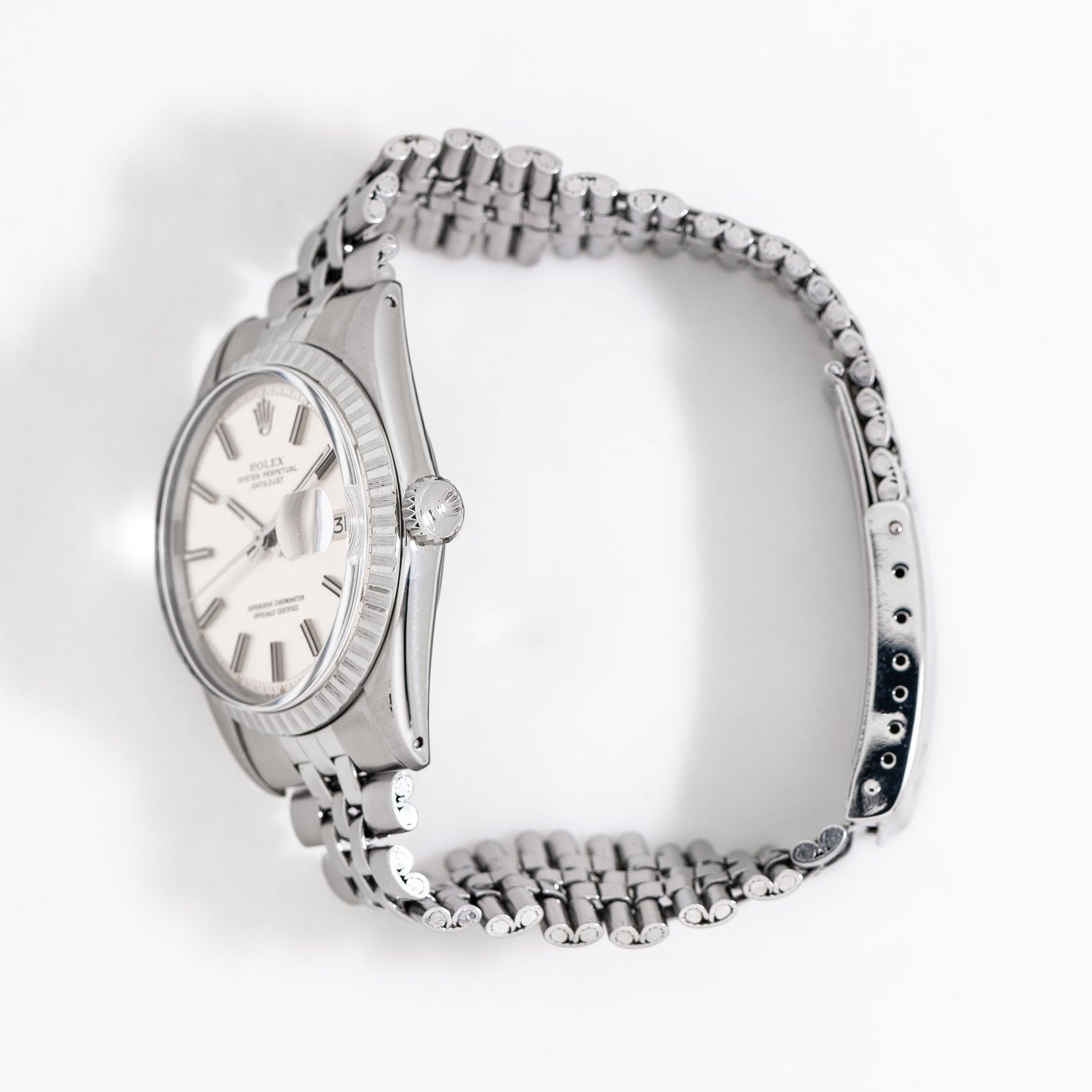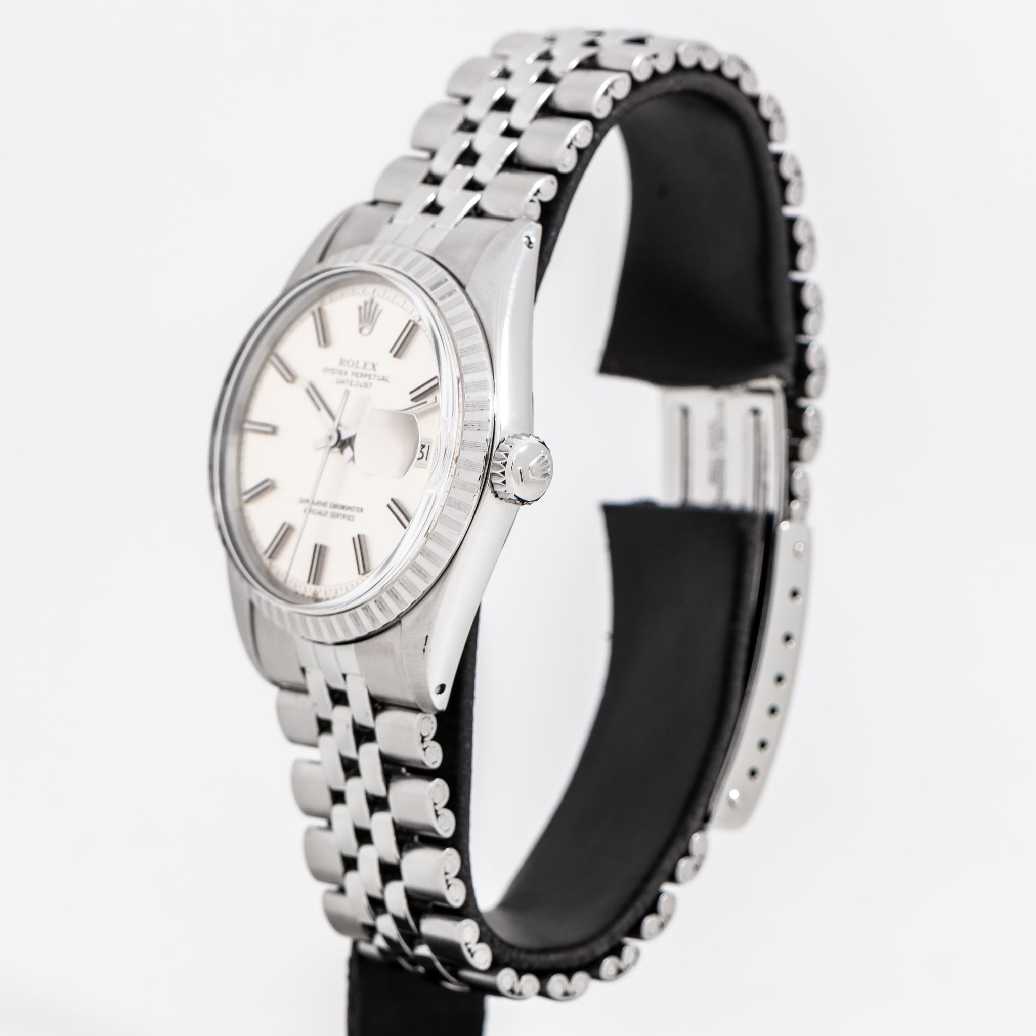Original Rolex Sigma Dial, Applied 14k White Gold Bar Markers with Black Colored Accents, a Date Window at the 3 o Clock Position |