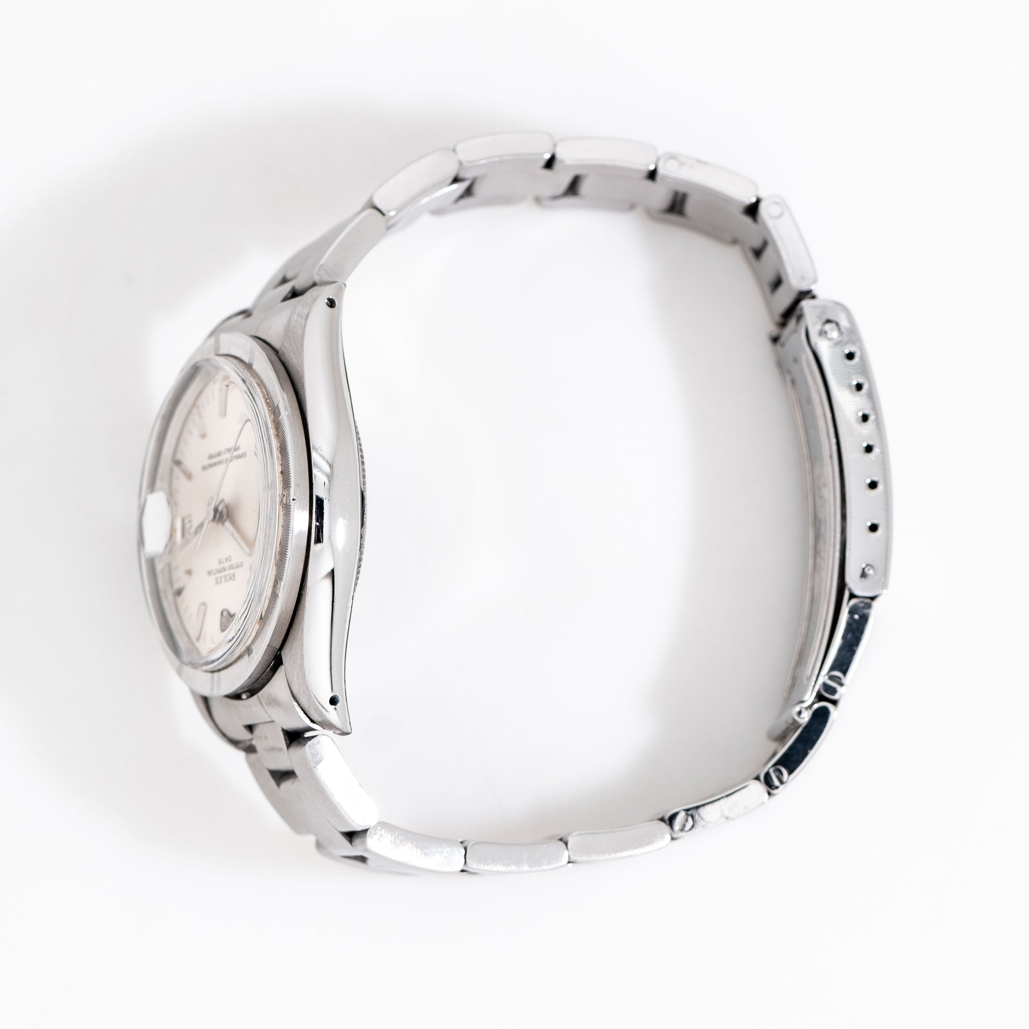 1976 Vintage Rolex Oyster Perpetual Date Ref. 1501 Watch in Stainless Steel. Features an all Original Rolex Silver Sigma Dial in Excellent Condition with Applied 18k White Gold Bar Hour Markers, a Printed Black Colored Minute Track, Date Window at the 3 o Clock Position, and Steel Baton Hands with Luminous. Comes on a Genuine Rolex 19mm Solid Link Oyster Bracelet that will fit up to an 8 Inch Wrist Size. Powered by a 26 Jewel Caliber 1570 Automatic Winding Movement. Triple Signed. Swiss Made.