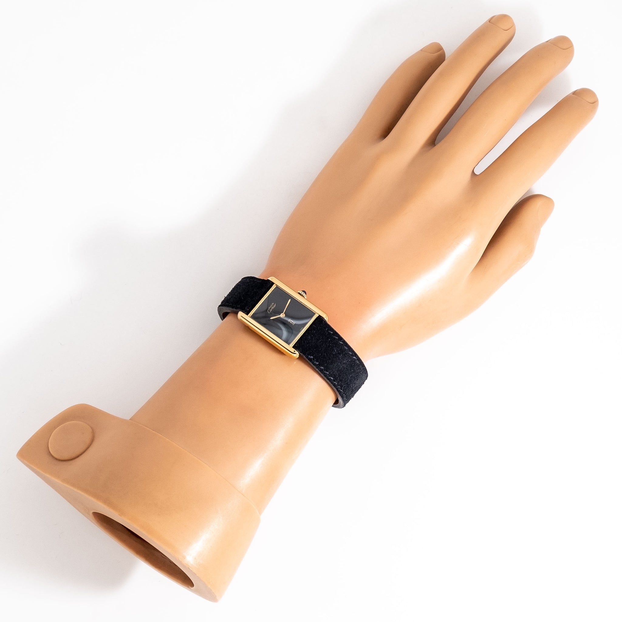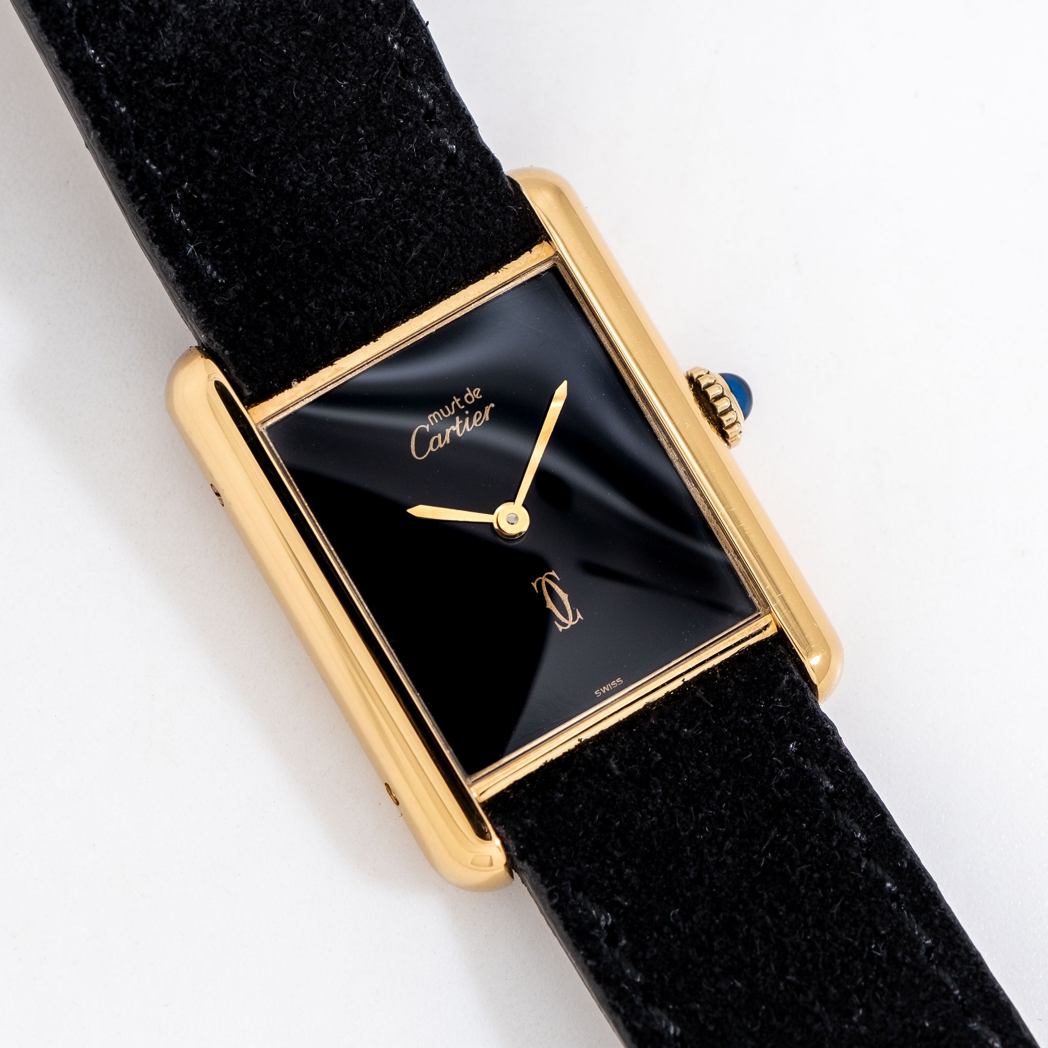 1990's Era Cartier Tank Must De 18k Yellow Gold Plated over Sterling Silver Watch. Features an Original Cartier Black Colored Dial in Very Good Condition with Yellow Gold Colored Steel Sword Hands, and a Printed Yellow Gold Colored Cartier Emblem at the 6 o Clock Position. Comes on a Genuine Suede Leather Black Colored Strap with the Original Cartier Buckle. Powered by a 17 Jewel Caliber 2512 ETA Manual Wind Movement. Triple Signed. Swiss Made.
