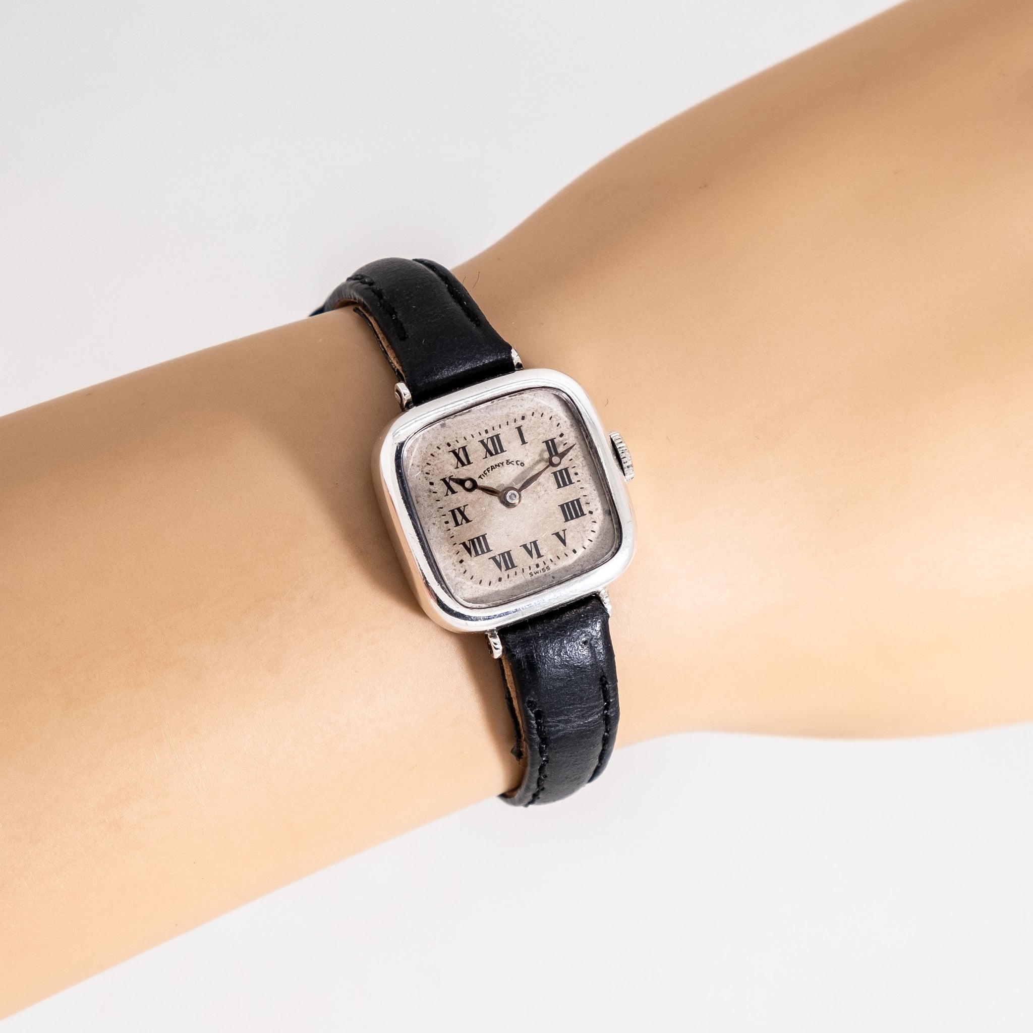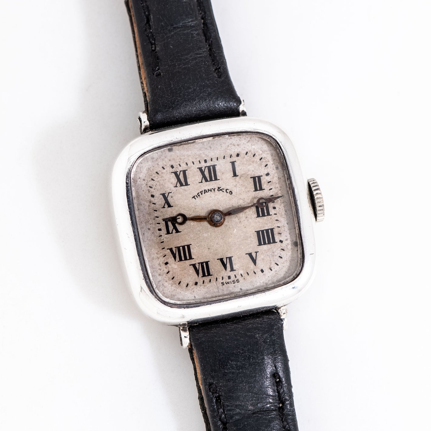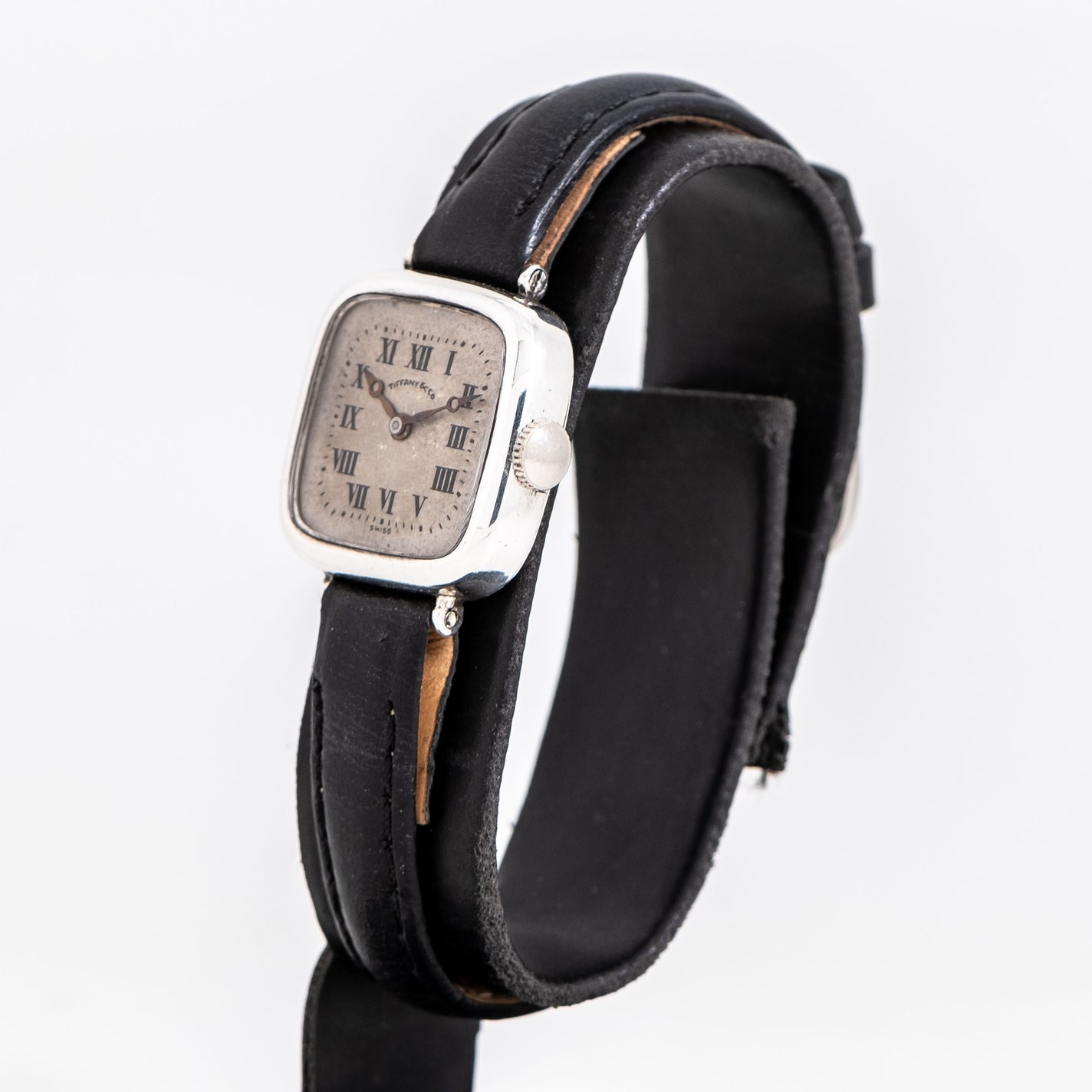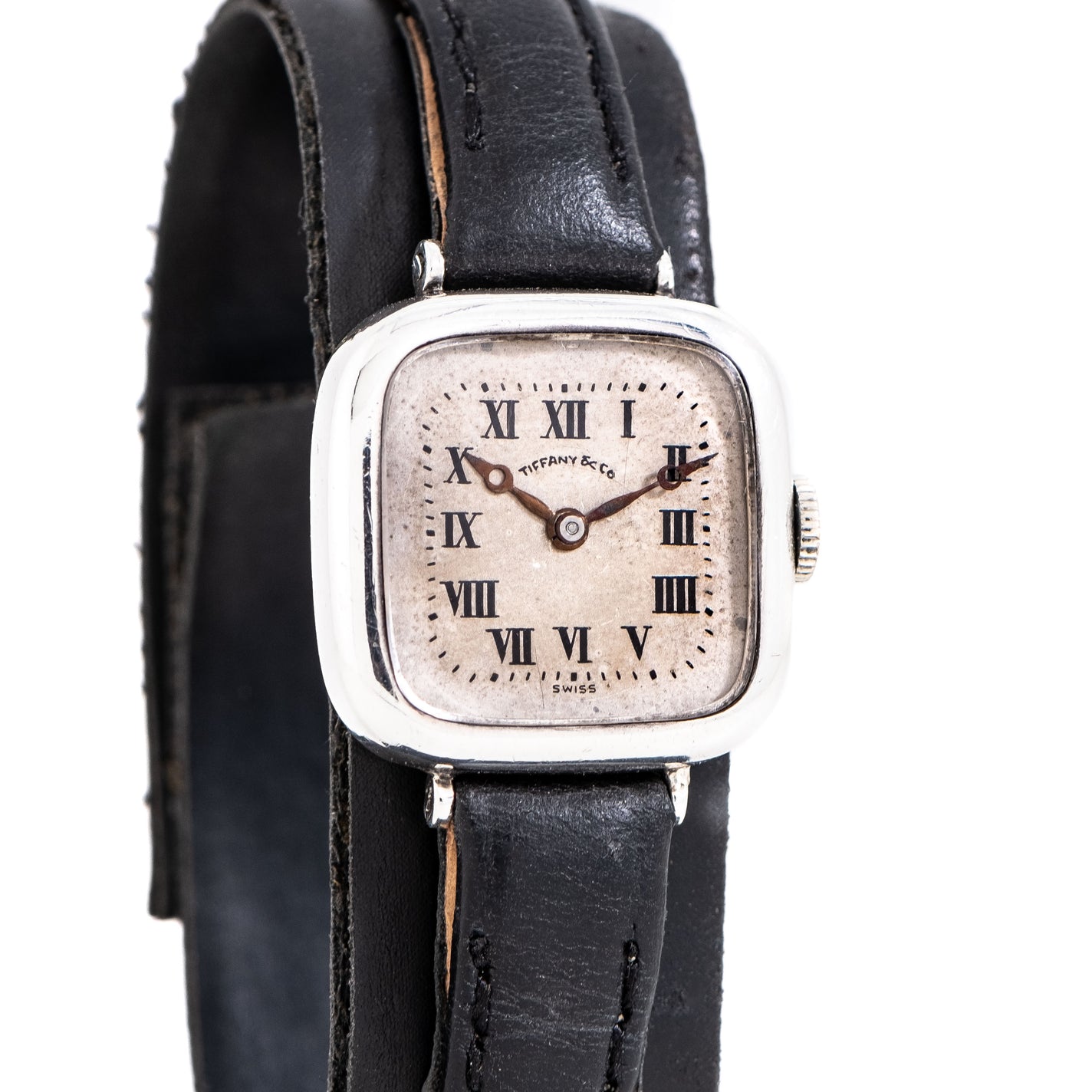 1915 Vintage Longines for Tiffany & Co. Sterling Silver Watch. Features an all Original Silver Dial with Warm Aged Patina, Printed Black Colored Roman Numerals, Black Breguet Hands, and Solid .925 Sterling Silver Constructed Case. Case Back Engraved  "Mrs. Joseph P. Clune Detroit".  Comes on a 10mm Black Colored Genuine Leather Strap. Powered by a 15 Jewel Longines Caliber 9.35 Manually Wound Movement. Triple Signed. Swiss Made.