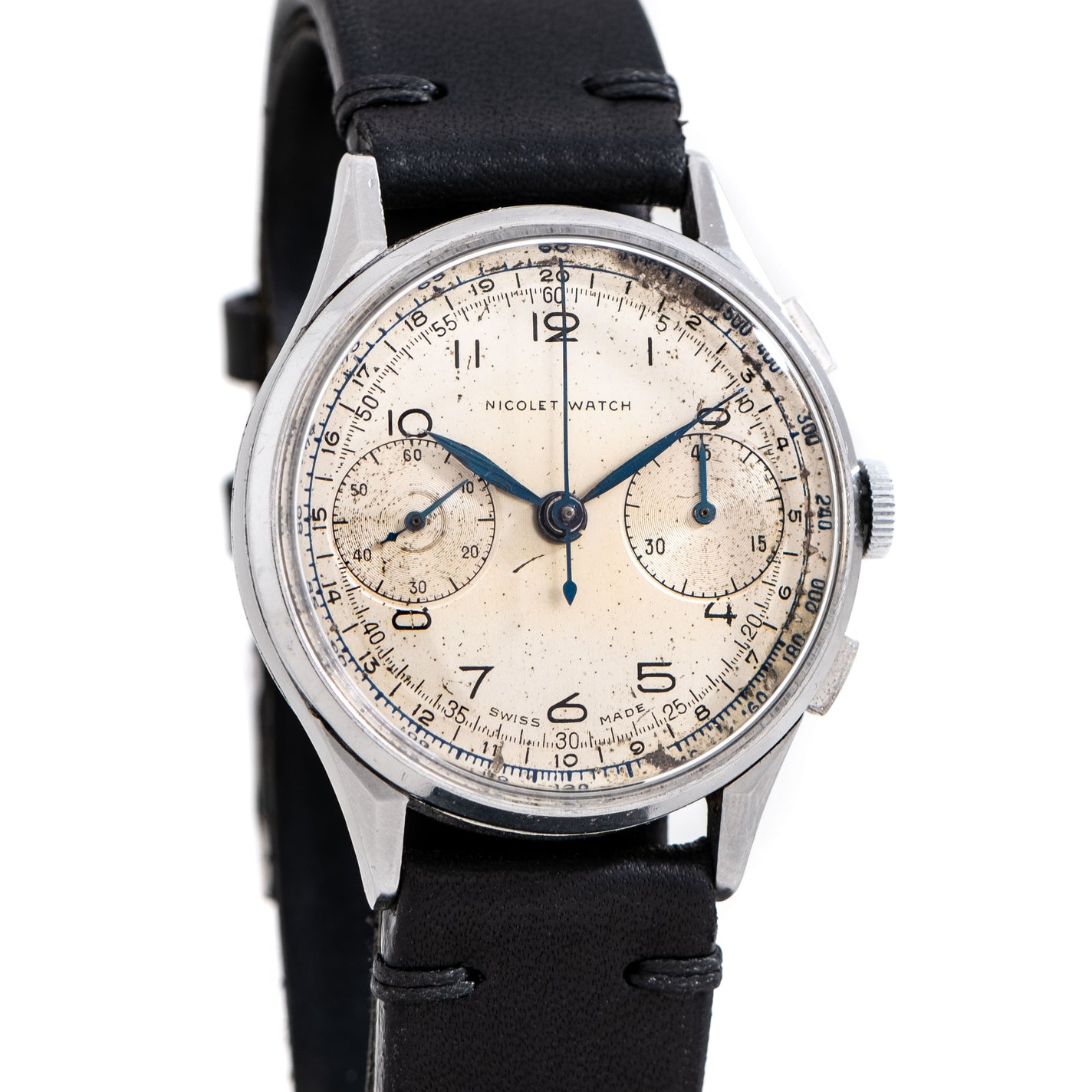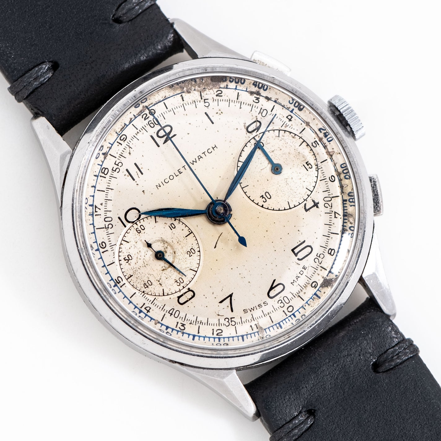 1950's Vintage Nicolet Two-Register Oversized Chronograph Stainless Steel Watch. Features an all Original Warm Aged Silver Dial with Beautifully Aged Patina, Printed Black Colored Arabic Numerals, Printed Blue Colored Tachymeter, an Oversized Case measuring in at 37mm, and Blued Steel Leaf Hands. Comes on a 20mm Genuine Leather Black Colored Strap. Powered by a 17 Jewel Caliber Landeron 39 Manual Winding Movement. Triple Signed. Swiss Made.