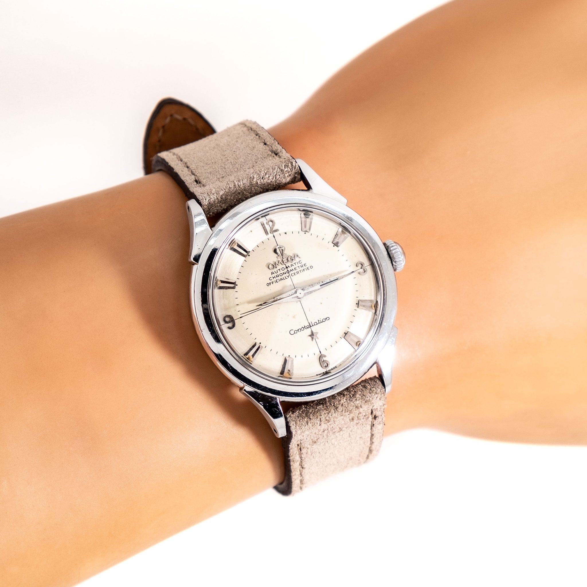 1956 Vintage Omega Constellation Ref. 2852 6 SC Stainless Steel Watch. Features an all Original Silver Dial with Beautifully Aged Patina, Applied Steel 12, ,3 ,6, 9 Arabic Numerals, Applied Steel Beveled Hour Markers, Printed Black Colored Minute Track, and Steel Dauphine Hands with Aged Luminous. Comes on an 18mm Genuine Suede Leather Beige Colored Strap. Powered by a 19 Jewel Caliber 501 Automatic Winding Movement. Triple Signed. Swiss Made.