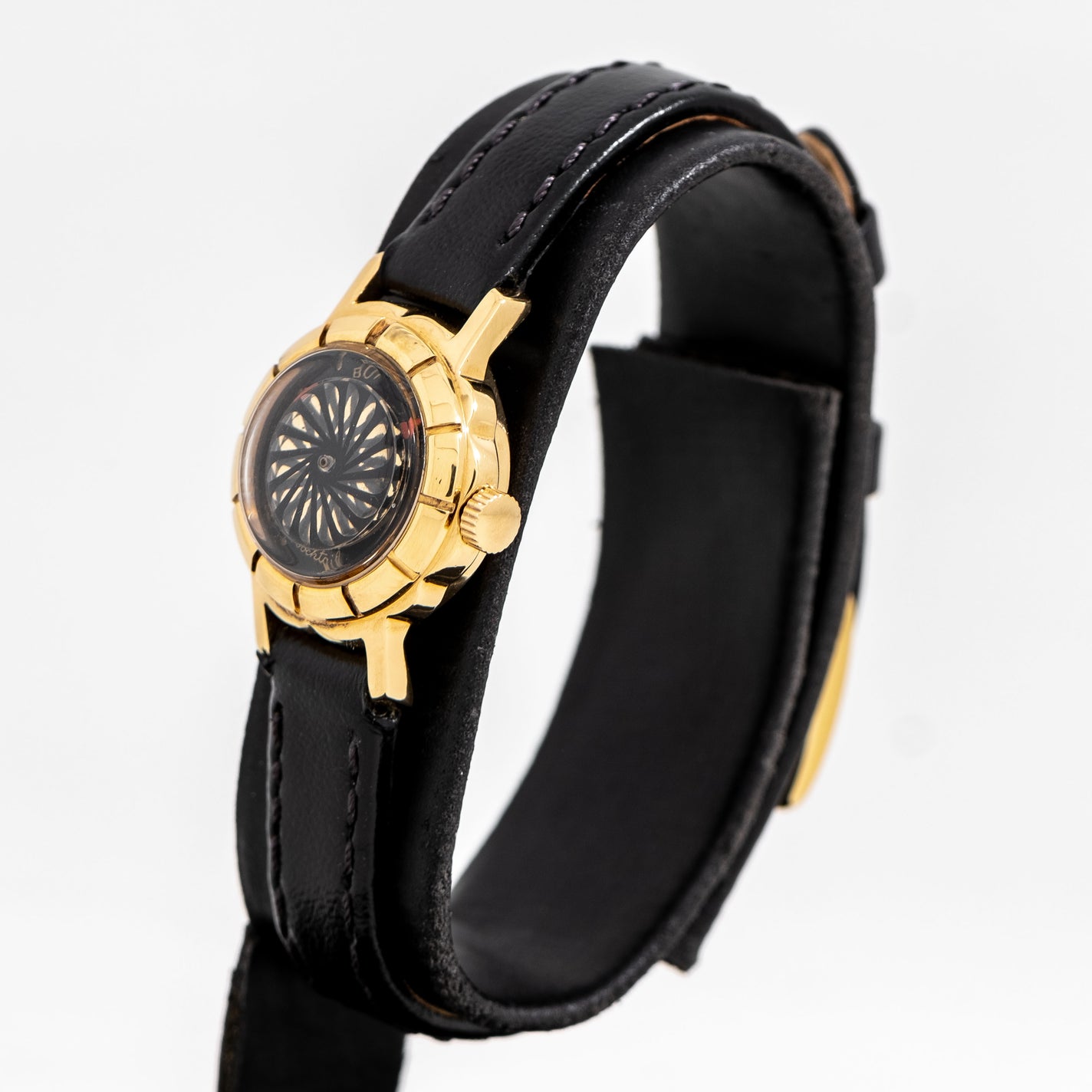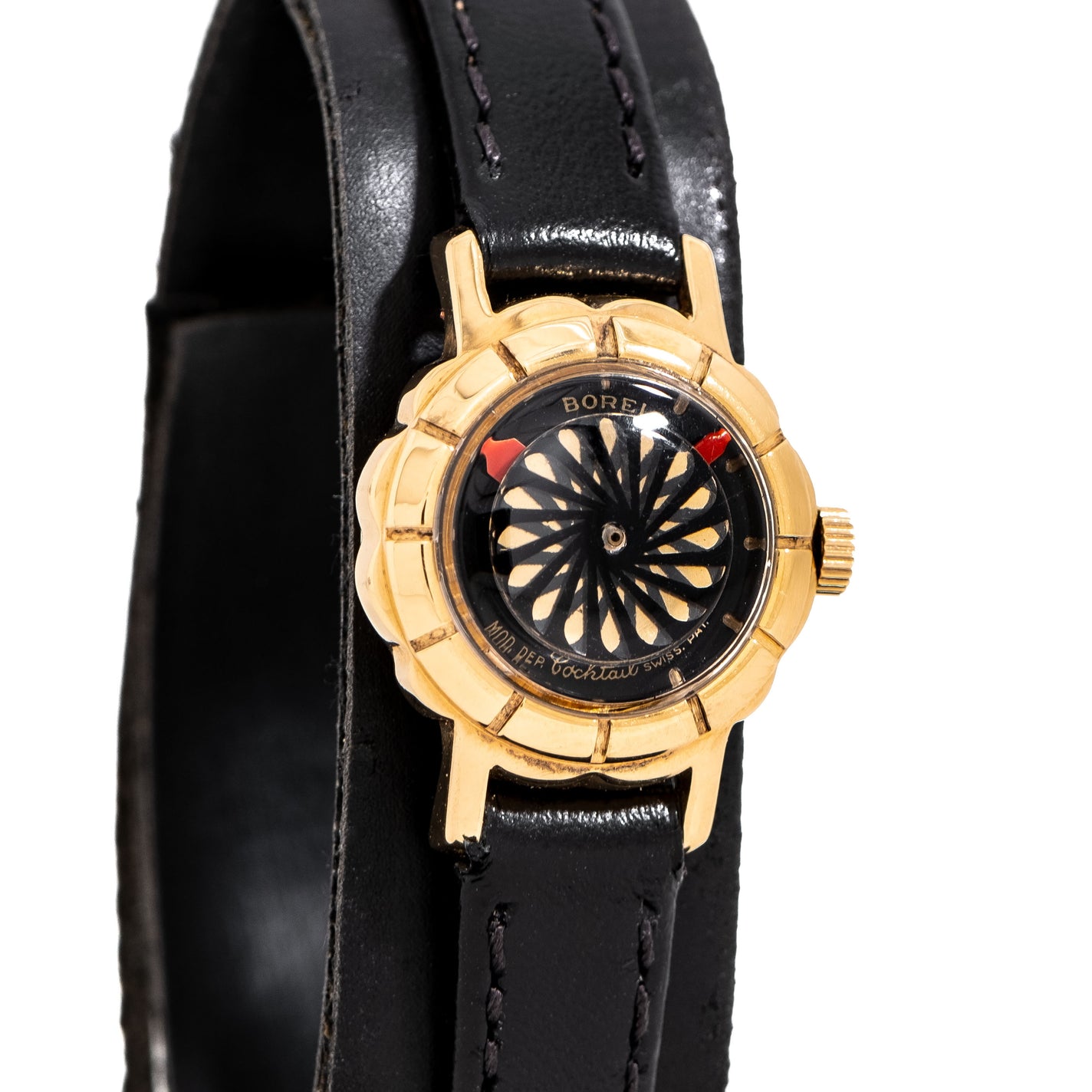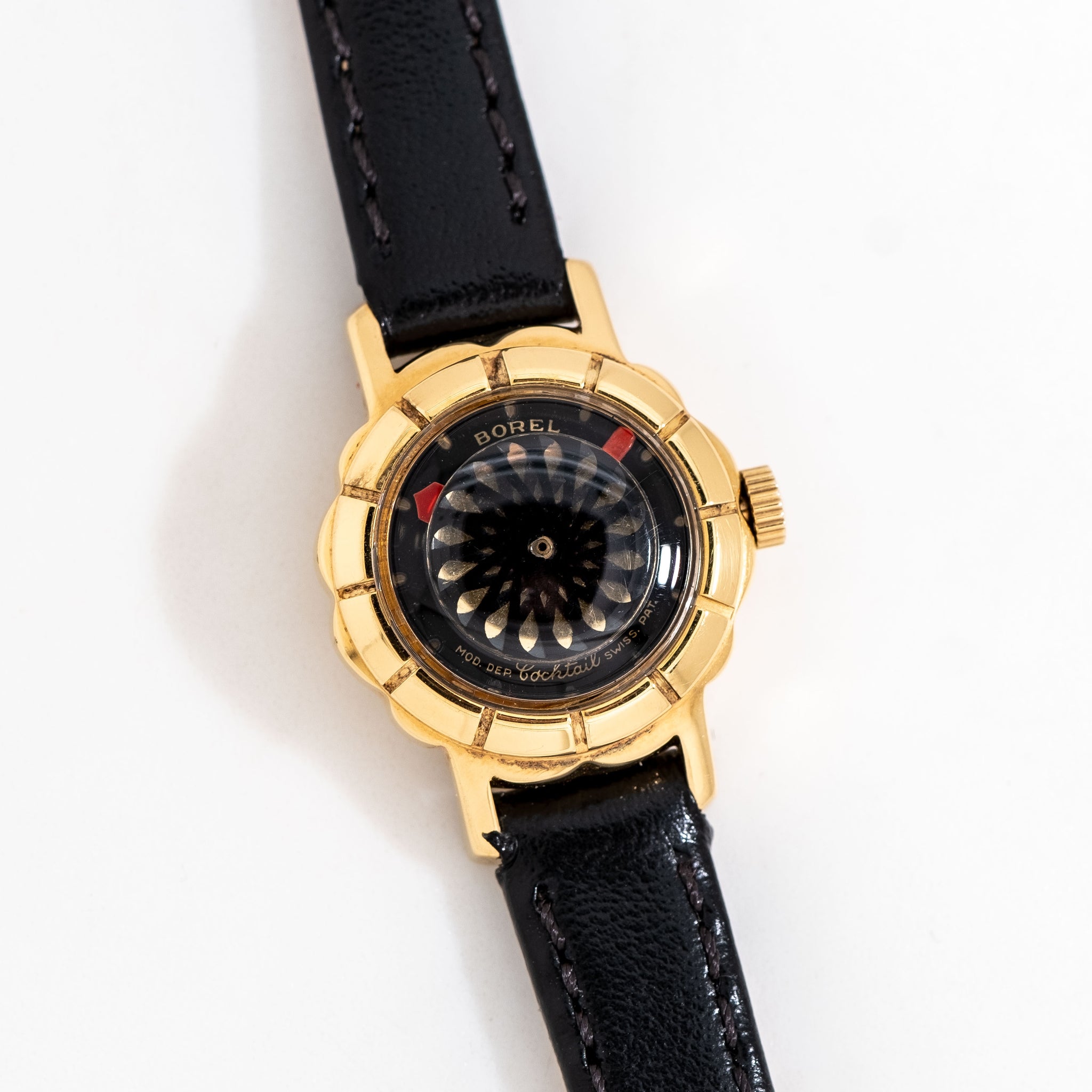1980's Vintage Ladies Ernest Borel KALEIDOSCOPE Cocktail Watch in 18k Yellow Gold Plated over Stainless Steel. Features an all Original Black Colored KALEIDOSCOPE Dial with Red Colored Index Hands and Gold Colored Markers & Text. Comes on an 9mm Genuine Leather Black Colored Strap. Powered by a 17 Jewel Ernest Borel Caliber Manual Winding Movement. Triple Signed. Swiss Made.